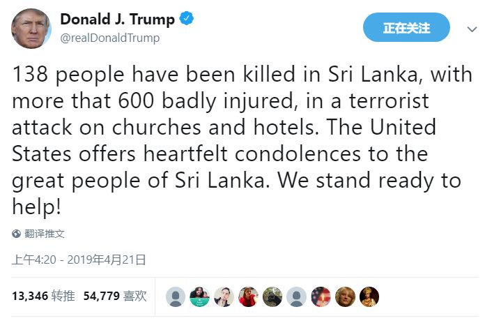 “在针对斯里兰卡的教堂和酒店的恐怖袭击中,有138人被杀,600多人受重伤。美国向伟大的斯里兰卡人民表示衷心的哀悼。我们准备随时提供帮助!”