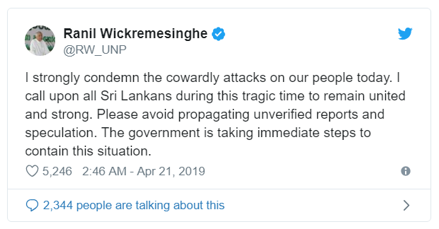 “我强烈谴责今天针对人民的懦夫式攻击。在这个悲惨的时刻,我呼吁所有斯里兰卡人保持团结和坚强。请避免传播未经证实的信息和猜测。当地政府正在立即采取措施控制这种情况。”
