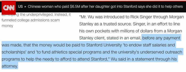 吴经理的律师则称,吴本人是根据摩根·斯丹利公司的推荐列表,向赵涛家介绍了辛格及其团队。觉得是“有口碑”的升学指导。而且,辛格自己私吞了几百万美元的捐款,违背了他的客户赵雨思家的意图——给斯坦福大学捐几百万美元,用于提高员工工资水平、赞助奖学金和建设斯坦福的运动队。
