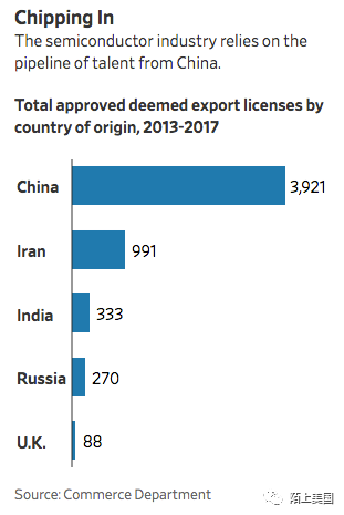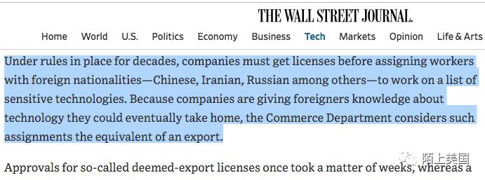 美国商务部有一条施行了几十年的规定,美国公司在高科技敏感方向上招收中国、俄罗斯、伊朗等几个国籍的员工的时候,需要申请执照,并且把这种雇用看作是某种程度上的”对外的技术出口(deemed-export licenses )“。