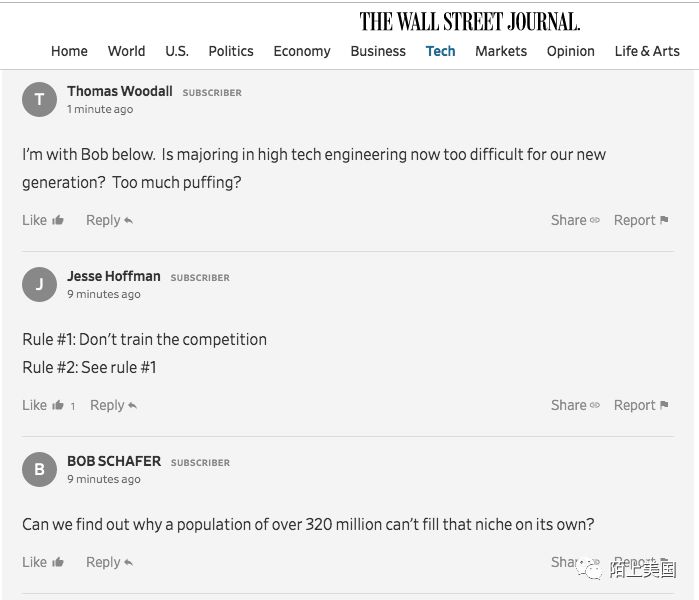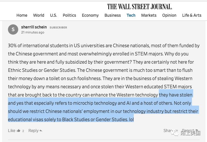 那么美国大众怎么看待这事?《华尔街日报》算是集合了不少受教育程度高、立场也不极端的保守派读者的媒体平台。笔者扫了几眼他们相关新闻的评论区,虽然也有一些人在表达欢迎中国移民、将民间和国家利益区分开来的观点,但是,不难捕捉的不友好情绪却是该新闻所附留言区的主旋律。