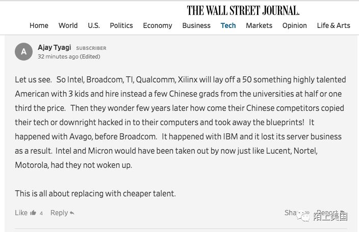 下面这条更是值得谷歌华人高级工程师们看看,在这个美国人眼里,诸位辛苦奋斗学位,毕业找到硅谷的好工作,不过是用”三分之一到一半的工资“贱卖自己的脑力,抢走有三个孩子的美国中年人竞争者饭碗的行为。后面颇有几个人跟进,认同中国人乐意拿低工资在美国讨生活的看法。