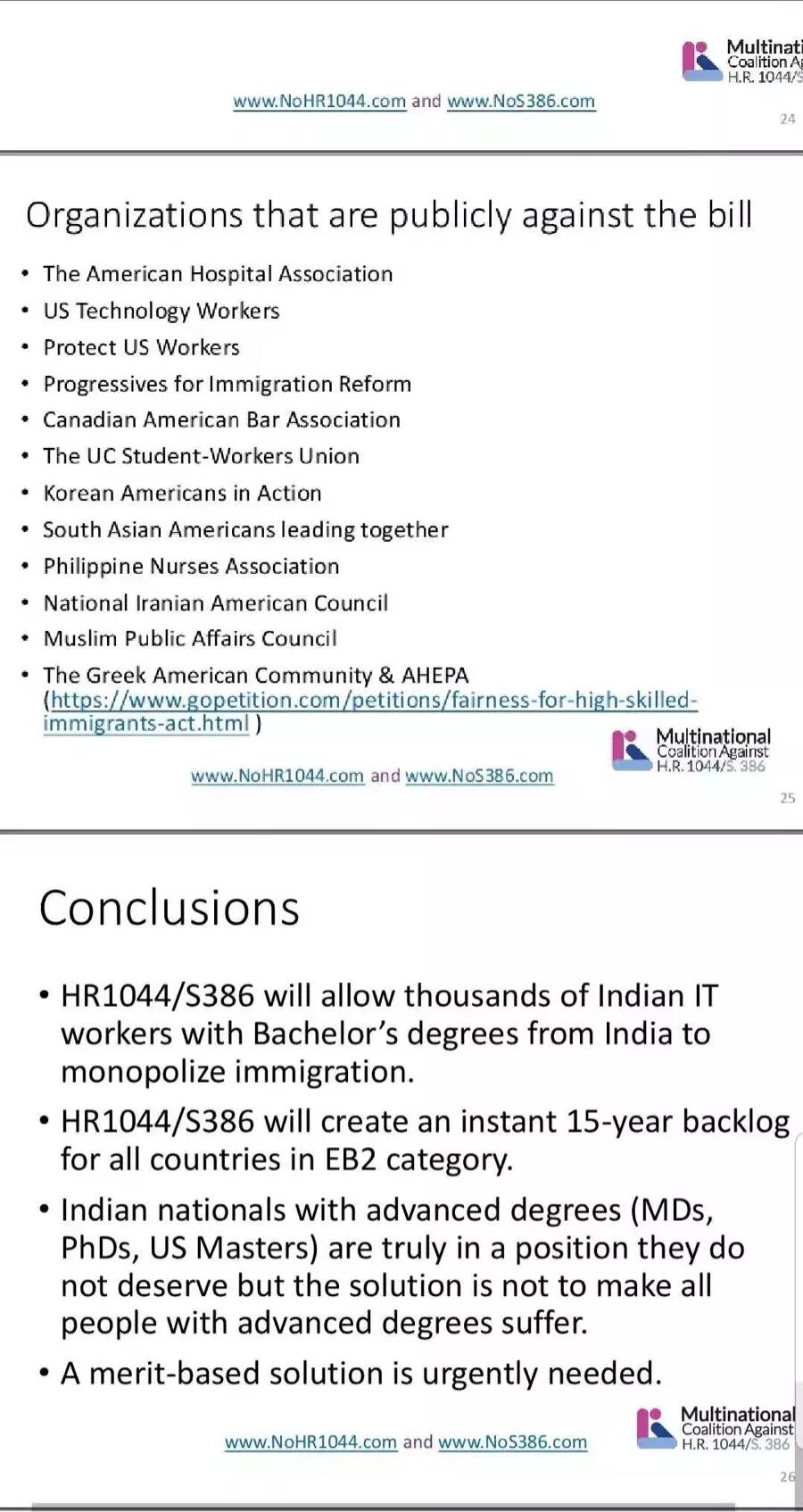 HR1044的公开反对者之一是美国医院联盟,"American Hospital Association"。反对的理由是,非IT行业的移民的排期要突然增加很多。大量的医护人员是从海外来的,这下美国医院没有足够的护士医生,病人健康岌岌可危。他们要求给医生护士排期优先权。