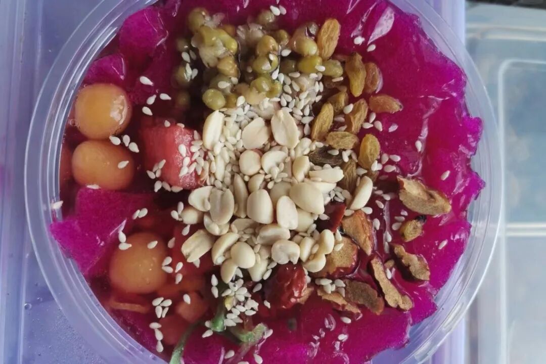 一个简易的小车,一张折叠桌椅,推在小区小学的附近。自制的手搓冰粉、芋圆、红糖水,加上花生仁、葡萄干、蜂蜜、水果,大大小小七大罐八大瓶,隆重地堆堆叠叠,码放在小车上,热热闹闹。她戴上遮阳帽、系上白色围巾,立马融入成最常见的街边小贩,在嘈杂的街上,那么生疏,又那么自然。那么弱小,又那么坚定。等侯路人来买一碗冰粉。