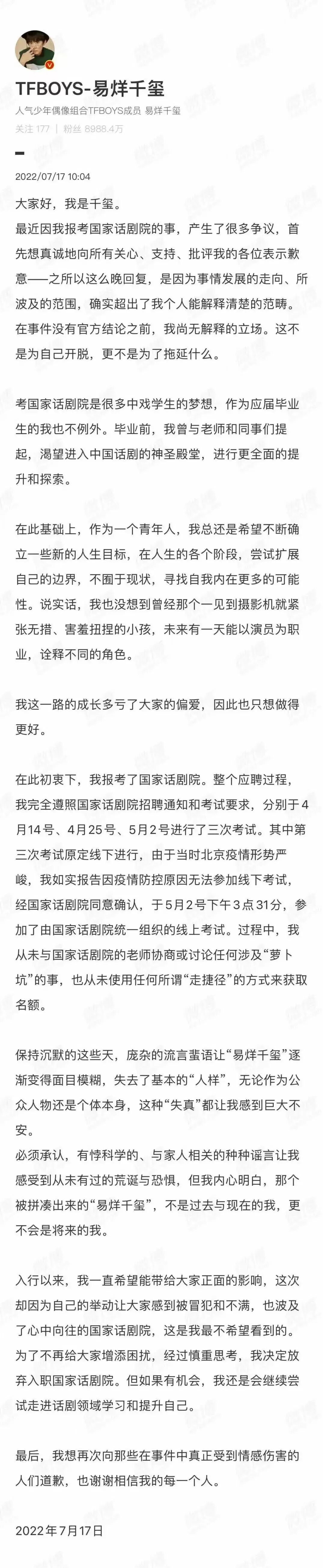虽然在后来国家话剧院给出的关于整个选拔过程的回复调查中,明确指出整个考试未出现舞弊现象,所有考生均按照正常考试进程和规定,直接说明三人考试合规。可就是在这样的解释下,面对巨大的舆论压力,易烊千玺昨日还是正式通过微博宣布,放弃入职国家话剧院。