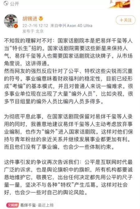各种质疑他们走后门、开小灶、违规录取等议论层出不穷,三人被轮番挂在热搜展示,冲在前面的易烊千玺压力最大,粉丝数量在持续降低,过去一段时间商誉和个人名誉也持续受损,媒体、粉丝、看热闹的吃瓜群众纷纷要求国家话剧院给予说法。这期间以专门报道复杂中国见长的胡锡进也发话,建议易烊千玺放弃国家话剧院的编制。