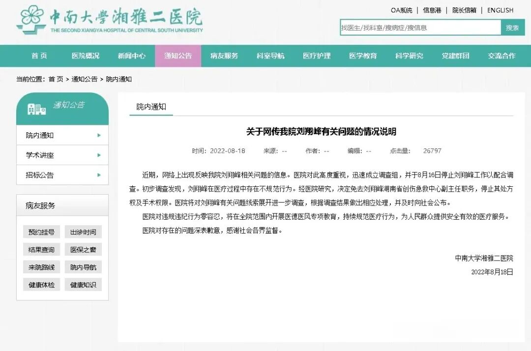 中国医师节前,一则有关医生的新闻引爆网络:8月17日,有网友反映中南大学湘雅附二医院副主任医师刘翔峰医疗作风有问题,比如,机器人做不完全性肠梗阻手术,开进去找不到梗阻段,就把正常肠管切下来给家属看;只要找他看病,稍微有点异物倾向,先做化疗,等等。次日,该院发布情况说明,承认刘翔峰在医疗过程中存在不规范行为,决定免去其湖南省创伤急救中心副主任职务,停止其处方权及手术权限。
