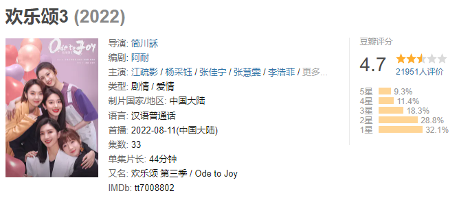 2016年,《欢乐颂》爆火,以一剧之力把都市女性群像剧推向了一个小高潮。第二年续集推出,原班人马如法炮制但是口碑大跌。时隔五年,再好用的配方用到第三遍也会审美疲劳,更何况换了阵容的剧情和演技全方位拉胯。