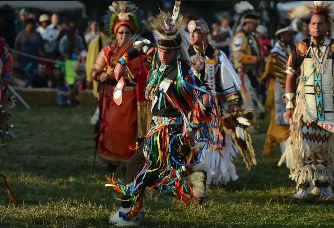 她从手机里打开视频,让我观看刨瓦节节目。来自全美各地乃至墨西哥的印第安部落代表,身着各式传统服装,一队接着一队依次入场。他们踏着四拍节奏的舞步,一脚踩两步,然后再换另一脚踩两步。这种基本节奏演绎出各种行进式舞步,小伙前后跳跃而充满阳刚之气,姑娘上下弹跳而不失亭亭玉立,妇女轻盈曼舞而保持优雅,领队的长者气定神闲,仍然一边踏步一边律动。
