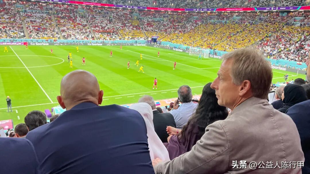 文章的最后,跟大家分享一个彩蛋。开幕式后东道主和厄瓜多尔比赛时,伙伴易一提醒我坐在我们前排右方有一个熟悉的身影。哎呀,这不就是整个九十年代威震世界足坛的德国前锋“金色轰炸机”克林斯曼嘛!本来很想比赛结束后跟他合个影的,但是无奈比赛到后面卡塔尔基本放弃了,后二十分钟几乎成了垃圾时间,克林斯曼提前一刻钟退场了。看着克林斯曼站起身来从面前一米处走过,恍然间感觉重逢了自己的青春。