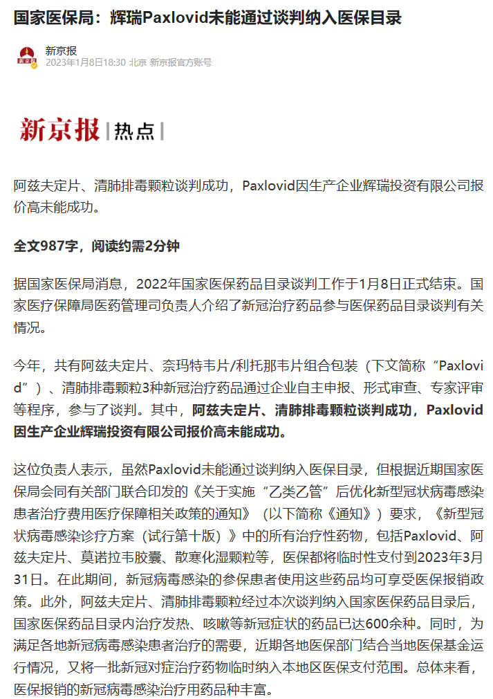 今天又看到《新京报》的消息,“阿兹夫定片、清肺排毒颗粒谈判成功,Paxlovid因生产企业辉瑞投资有限公司报价高未能成功。这位负责人表示,虽然Paxlovid未能通过谈判纳入医保目录,包括Paxlovid、阿兹夫定片、莫诺拉韦胶囊、散寒化湿颗粒等,医保都将临时性支付到2023年3月31日。“
