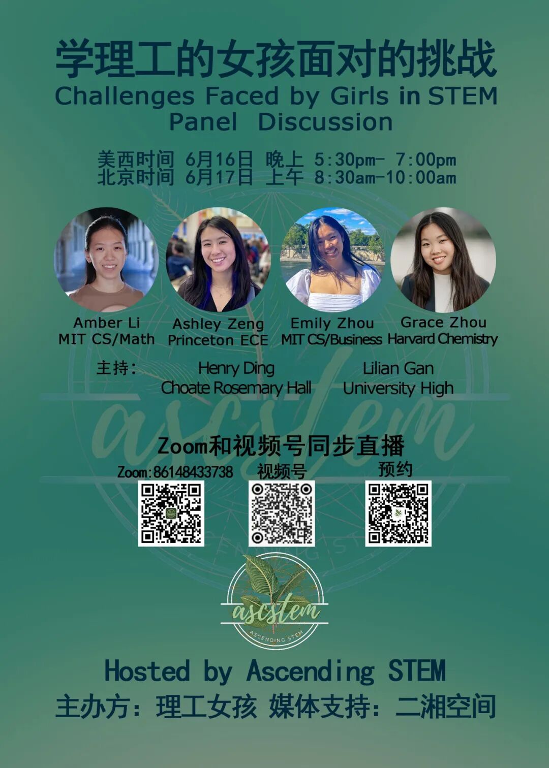 编者按:Ascending STEM (中文名字理工女孩)是一个致力于推动女孩进入STEM领域的非盈利组织,他们组织的这次活动邀请到的四位女孩不是传统印象中埋头读书的孩子,而是在艺术、运动和社区活动各方面全面发展的孩子,不仅成就出众,且才华横溢,有强大的领导力和创新能力。她们选择理工科经历了什么样的挑战?她们有着什么样的成长故事?欢迎来我们的直播间听听。如果你想在你所在的学校创建理工女孩的分会(school chapter),欢迎联系他们:contact.ascstem@gmail.com。