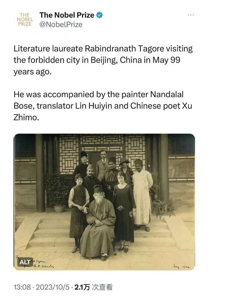 诺贝尔文学奖揭晓前几小时,诺贝尔奖的X(推特)官方账号发布了一张99年前文学奖获得者泰戈尔在中国参观紫禁城的老照片,照片注明陪同翻译为林徽因和诗人徐志摩。这一发布让人浮想联翩。
