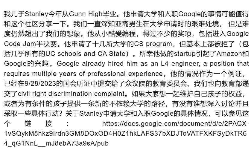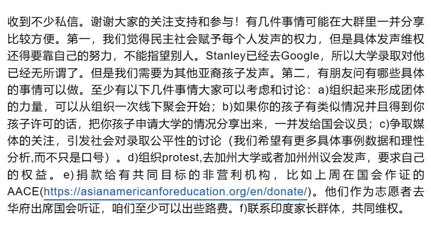 当然,光抱怨不解决问题。虽然Stanley已经去Google上班,对他来说大学录取已经无关紧要了,但是这个事情还是要讨个说法。Stanley's case在9月底通过国会听证会作证的形式,提交给了国会的教育委员会,希望他们能够向教育部和UC追责。根据大家的反馈,我们在周六10月7号组织了第一次会议。在线上线下一共有大约50位家长参加。我分享了一些Stanley的细节,也提议咱们如何组织起来,通过多个渠道要求UC给出具体解释。王耀明先生也到场给我们提供了帮助和指导。我们也创建了一个微信群,一天之内有159人加入。以上是这一周发生的事情。我们将会跟进,继续努力!”