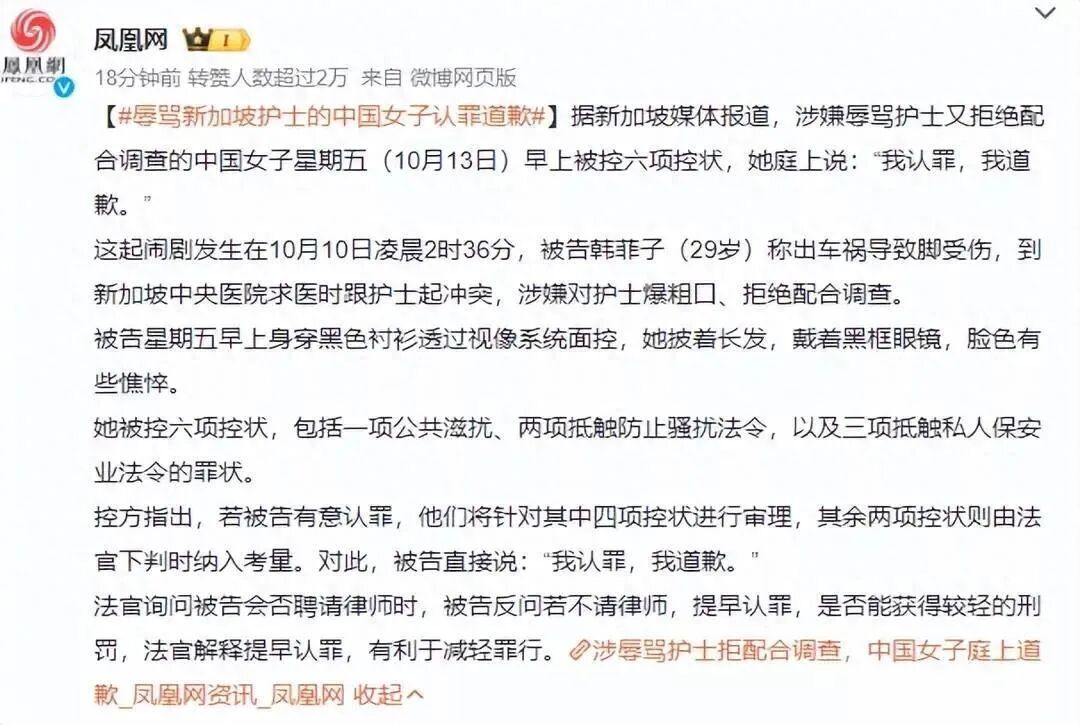 近日,一位韩姓“小仙女”在新加坡被代驾撞伤脚部,自己倒地二十分钟未被扶起,要求对方或赔偿五千块或送医院,被送入医院后向护士爆粗口,医院为此报警后,调查人员问话时,“小仙女”顾左右而言他,还自己把过程拍摄下来发到网上,并在网上发文表达自己就是要“狠狠反击”、“狠狠发脾气”,还把此事上升到种族歧视。之后她被控上法庭,目前已经认罪道歉,并等待进一步审理。