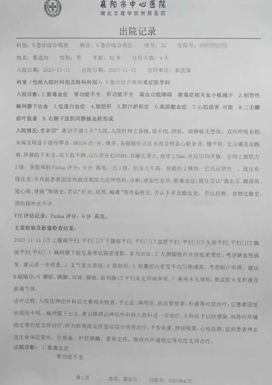 医生在下午的检查结果中,发现选军大脑有血肿,出血量有40毫升之多。之前的襄阳中心医院,只发现少量蛛网膜下出血。现在面临着要做开颅手术,清除淤血和止血,如果不做手术,继续出血,随时有生命危险。护士给我打电话告知风险:病人身体基础不好,脓毒血症,肝、肺、肾等多项功能异常,做开颅手术要几万元的费用,病人可能在手术台上就没了,手术后瘫痪或植物人的可能性也很大。如果做手术,要尽快。