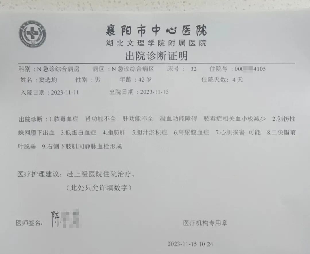 随后,一位姓游的医生,出来跟我们交流了选军的病情。脑出血,导致神志不清,行动受限;败血症,血液里有细菌感染,做了全身检查,查不出源头在哪里;持续发烧,已经好多天了,情绪急躁;除了血压还稳定,肝、肺、肾都异常。总而言之,病情严重。