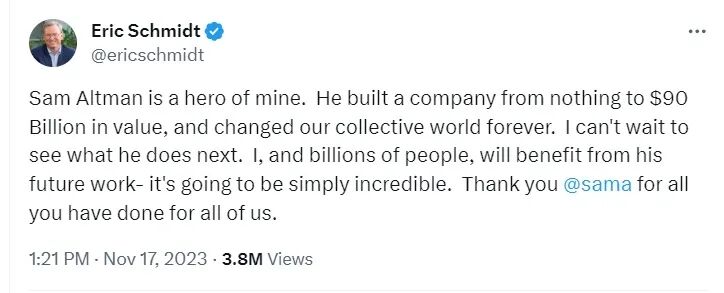 Google之前的CEO Eric Schmidt 发文说“奥特曼是我心目中的英雄。他从无到有地建立了一家市值达到900亿美元的公司,永远改变了我们的世界。我迫不及待想看到他接下来会做什么。我和数十亿人将从他未来的工作中受益, 这将是令人难以置信的。感谢奥特曼为我们所做的一切。”