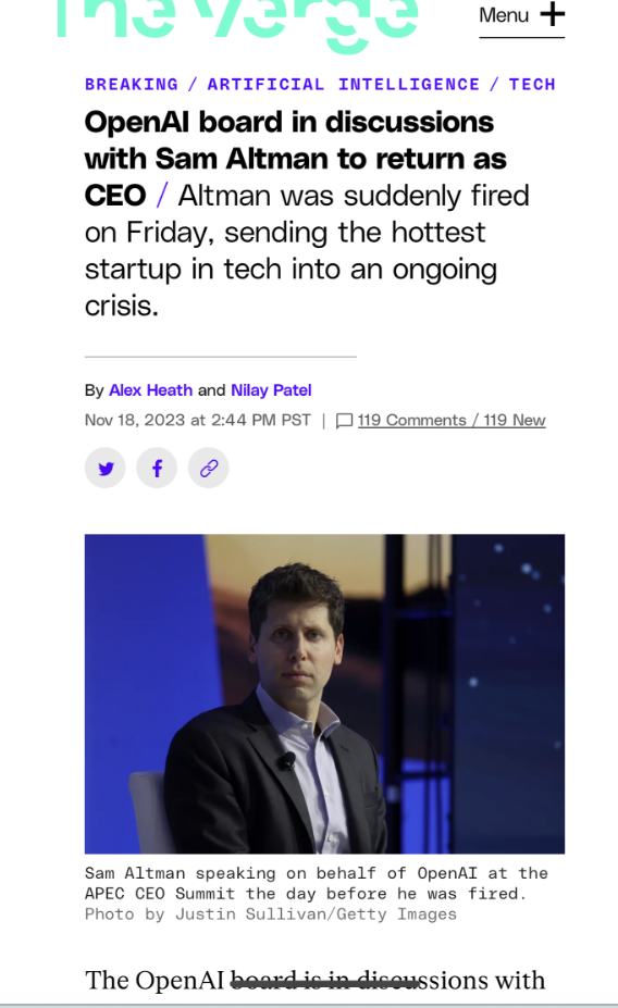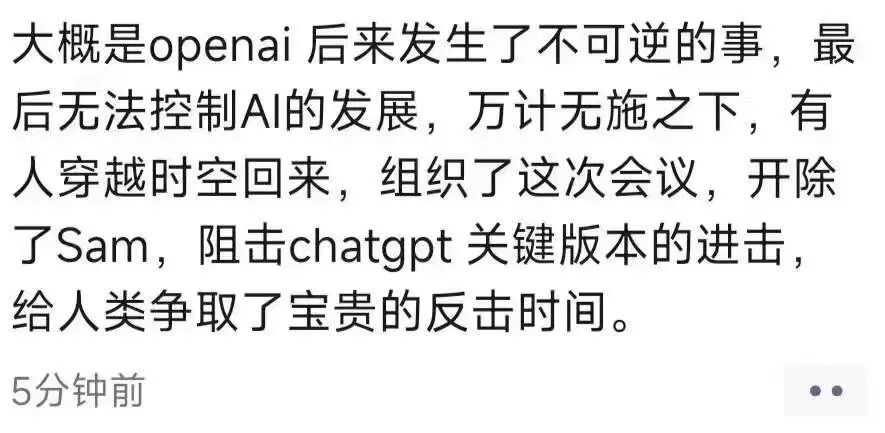 网上有传是因为奥特曼的妹妹控诉他对她的性暴力,个人感觉可信度不高,毕竟她妹妹没有什么credibility(可信度),而且这是之前的事情,应该和奥特曼出局无关,还有人开玩笑说是ChatGPT AI不受控制了,为了给人类赢得时间,开除了奥特曼。