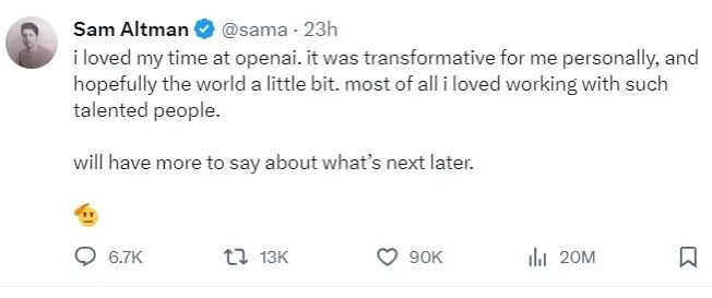 董事会发布消息后,奥特曼发推说他“热爱在OpenAI度过的时光。” 他说:“对我个人而言,这段时光是变革性的,也希望对这个世界有所贡献。最重要的是,我喜欢和如此有才华的人们一起工作。”