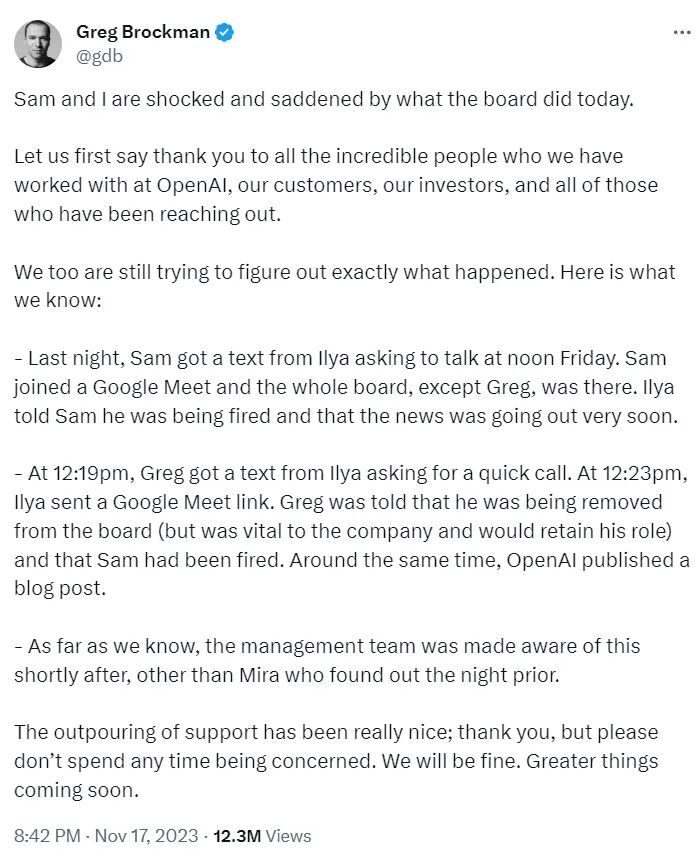 同时,OpenAI的另外一位创始人Greg Brockman也从董事会名单上除名,虽然还保留了他的职位。Brockman对董事会当天的决定感到震惊和悲伤。Brockman说,奥特曼被要求在上周五中午参加与董事会的视频会议,并立即被解雇。