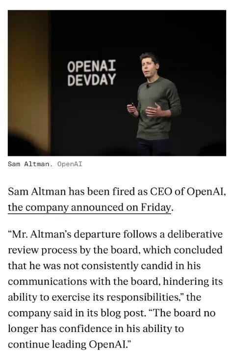 昨天最劲爆的新闻就是ChatGPT的母公司,OpenAI的创始人Sam Altman(奥特曼)被董事会踢出局的新闻了。董事会的声明可以说是一点也不客气:“奥特曼先生的离职是在董事会经过深思熟虑的审查过程后做出的决定。审查结果表明,他在与董事会的沟通中未能始终坦诚,从而阻碍了董事会行使其职责的能力,”公司在声明中表示,“董事会不再对他继续领导OpenAI的能力保持信心。”