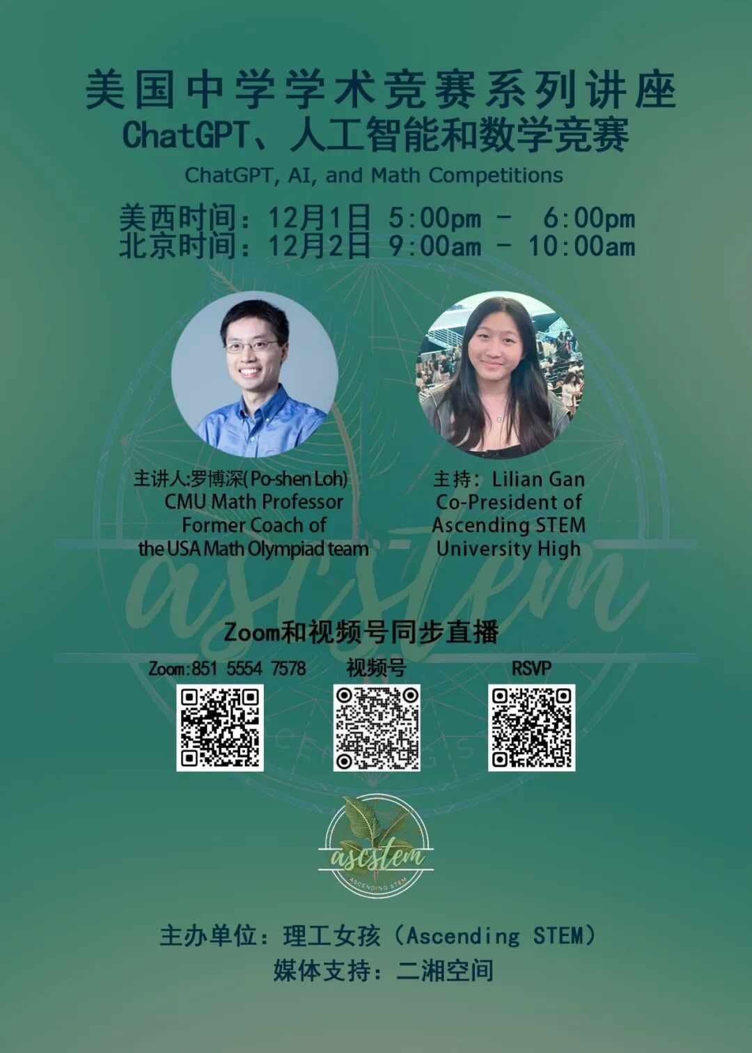 说了这么多,最好大家还是自己来听听他的讲座,其实是一个对谈。他和Ascending STEM的 Co-president Lilian的一个对谈。他们会谈到Pika, 谈到ChatGPT,也会谈到数学教育,形式很活泼,不是照着PPT讲,家长和孩子们可以来听听。讲座今天上午9点(北京时间)开始。大家可以去zoom(https://us06web.zoom.us/j/85155547578)听,也可以去视频号“二湘空间”听。