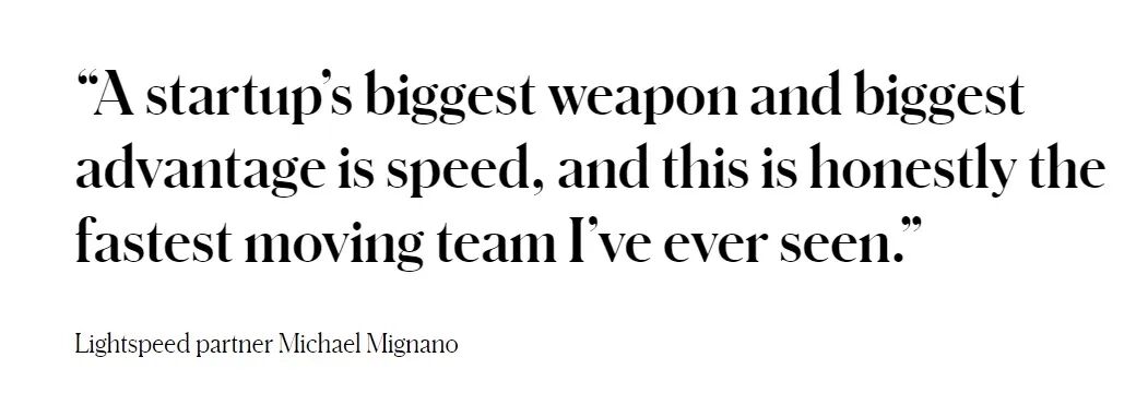 其次速度是她们胜出的一个关键词。其实AI视频公司竞争非常激烈,除了Runaway,还有我们之前知道的以生产高清AI照片著称的Midjourney,生产AI视频的Stability AI,还有谷歌和Meta也在做类似的产品。她们能脱颖而出很重要是因为她们的速度。今年夏天,Friedman建议他们添加一种将文本嵌入视频的功能。凌晨三点,他就收到了短信,告诉他已经做好了。正是这种超高速超高效的运作让他决定投更多钱给这家小小的Startup公司。九月加入投资的Lightspeed合伙人迈克尔·米尼亚诺认为这是Pika的关键优势:“初创公司最大的武器和最大的优势就是速度,而这绝对是我见过的最快速的团队”:
