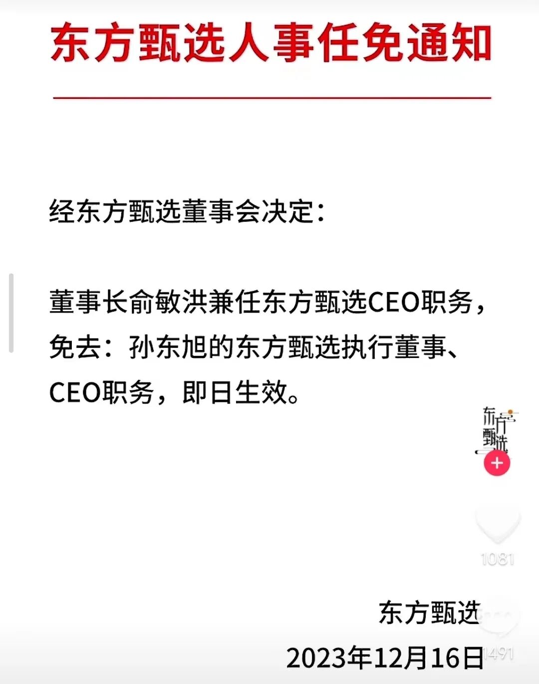 俞敏洪终于把东方小孙开了。