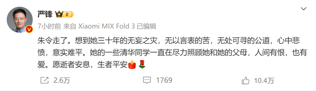 最先是看到的是来自严锋老师微博的信息:“朱令走了。想到她三十年的无妄之灾,无以言表的苦,无处可寻的公道,心中悲愤,意实难平。她的一些清华同学一直在尽力照顾她和她的父母,人间有恨,也有爱。愿逝者安息,生者平安。”