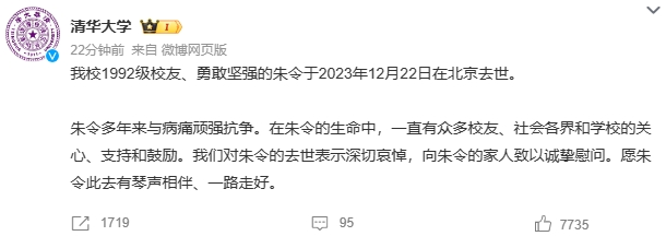 然后吴向军转给我一张清华大学发的信息:“我校1992级校友、勇敢坚强的朱令于2023年12月22日在北京去世。朱令多年来与病痛顽强抗争。在朱令的生命中,一直有众多校友、社会各界和学校的关心、支持和鼓励。我们对朱令的去世表示深切哀悼,向朱令的家人致以诚挚慰问。愿朱令此去有琴声相伴、一路走好。“