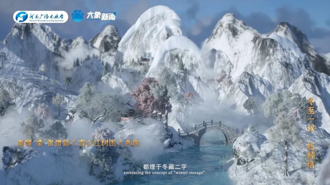 尤为值得一提的是,制作方利用AI和3D技术还原了三幅中国雪景古画的场景。现存最早由南朝梁张僧繇所作的雪景山水画《雪山红树图》、唐代王维创作的雪景图《江干雪霁图卷》、五代巨然创作现藏台北故宫博物院的中国水墨画《五代巨然雪图》,三幅名画活灵活现地再现于屏幕之上。受限于竖条幅画限制的山水风雪在AI扩图的辅助下,变成横幅风景,视野宽广辽阔。古人眼中的雪景被笔墨渲染在宣纸上,今人得以在屏幕上重享,何其幸也。