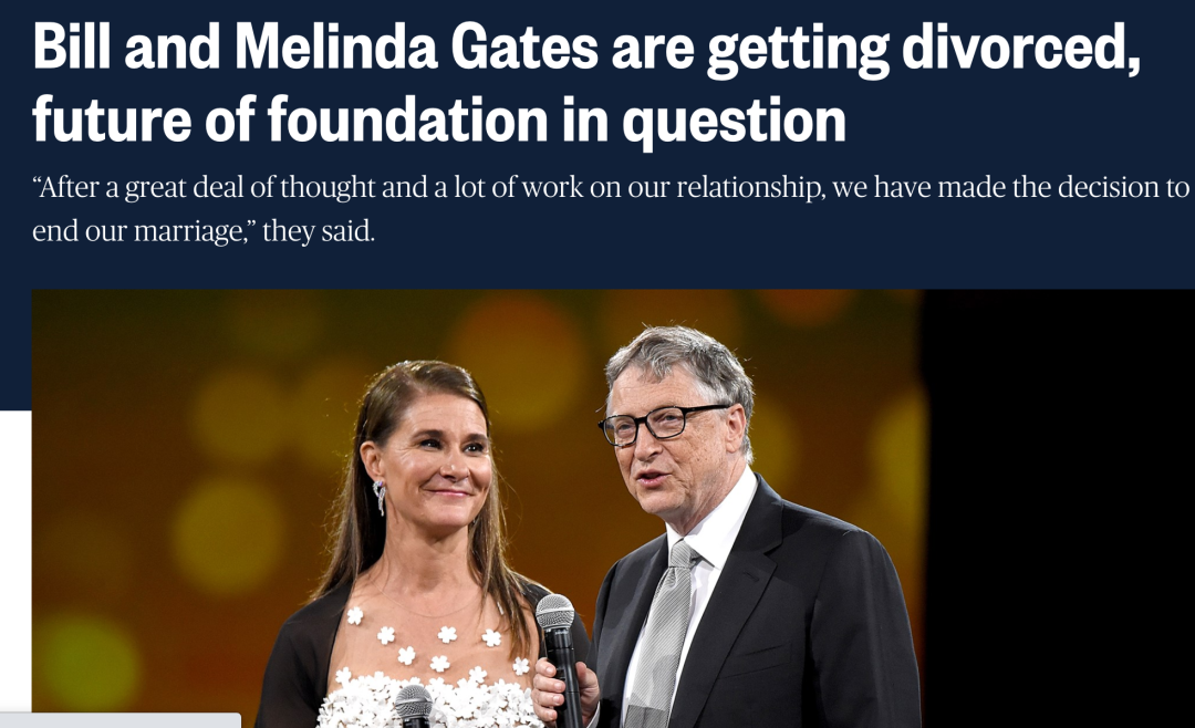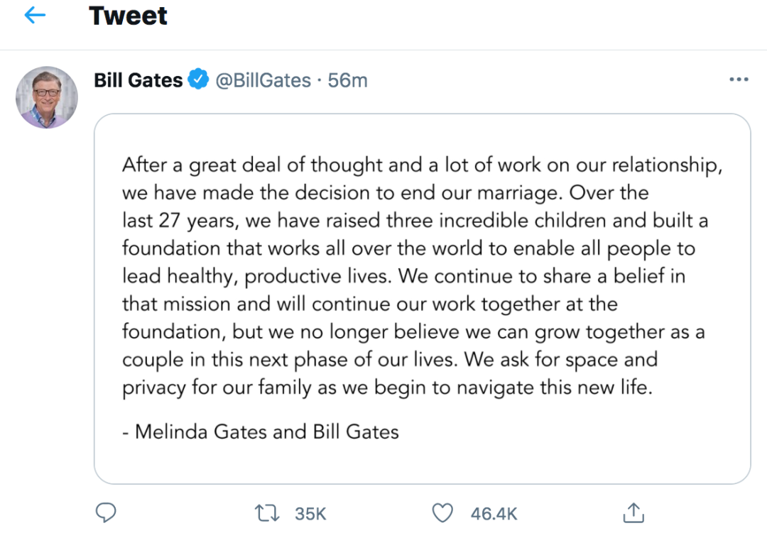今天最震惊的消息大概是比尔盖茨离婚的消息了。比尔•盖茨和他的妻子梅琳达在结婚27年后宣布离婚。盖茨在他的tweet上说:“经过深思熟虑和对我们的关系的许多努力之后,我们决定结束我们的婚姻。过去的27年里,我们共同养育了三个优秀的孩子,共同建立了一个基金会帮助全世界的人们过上健康和有效的生活,我们将继续分享对这个基金会使命的信念,将来还会一起合作。但我们觉得不再可能作为一对夫妇共同成长,请给我们一些空间和隐私,让我们开始新的生活。“