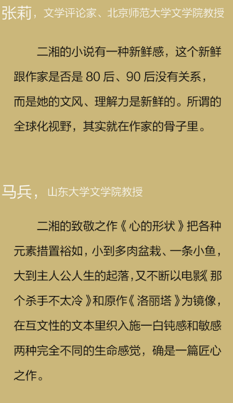 二湘,喜欢码字,著有长篇小说《暗涌》《狂流》,小说集《重返2046》。