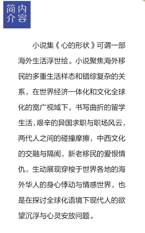 看到自己最新的小说集《心的形状》的新书照片时,心里是欢喜的,还有一点点激动。《心的形状》是我第一次在国内结集出版的小说集,精选了我从2017年到2022年创作的9个小说。四年了,几经波折,我的小说集也终于出版了。上一次出书,还是疫情前的2019年。那年冬天,我回国去上海、广州和北京做了三场《暗涌》新书分享会。然后很快就是疫情,发生了那么多事情,但幸运的是,我一直在写。