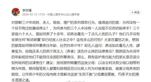 这两天我读了一些文章,都在谴责这仨恶魔少年。有的质疑中国的户籍制度,孩子父母去城里打工,孩子要读书,必须有当地户籍,因此不能跟随父母在城里读书,只好留在原户籍地老家,这样的留守儿童会出现很多问题。有的问责社会这个大染缸,人心不古的当下,孩子的教育是个空白,等等。有的认为有极少部分人就是基因里有坏钟。不管是留守儿童,还是孩子教育,还是天生坏钟,我认为很重要的一个防范措施就是学校和社会要对霸凌行为有惩治。杀人这样的大恶之前肯定有无数次的霸凌,如果这些小的霸凌行为被学校惩治了,如果这些坏孩子知道自己的小恶会招致惩戒,又何至于此?