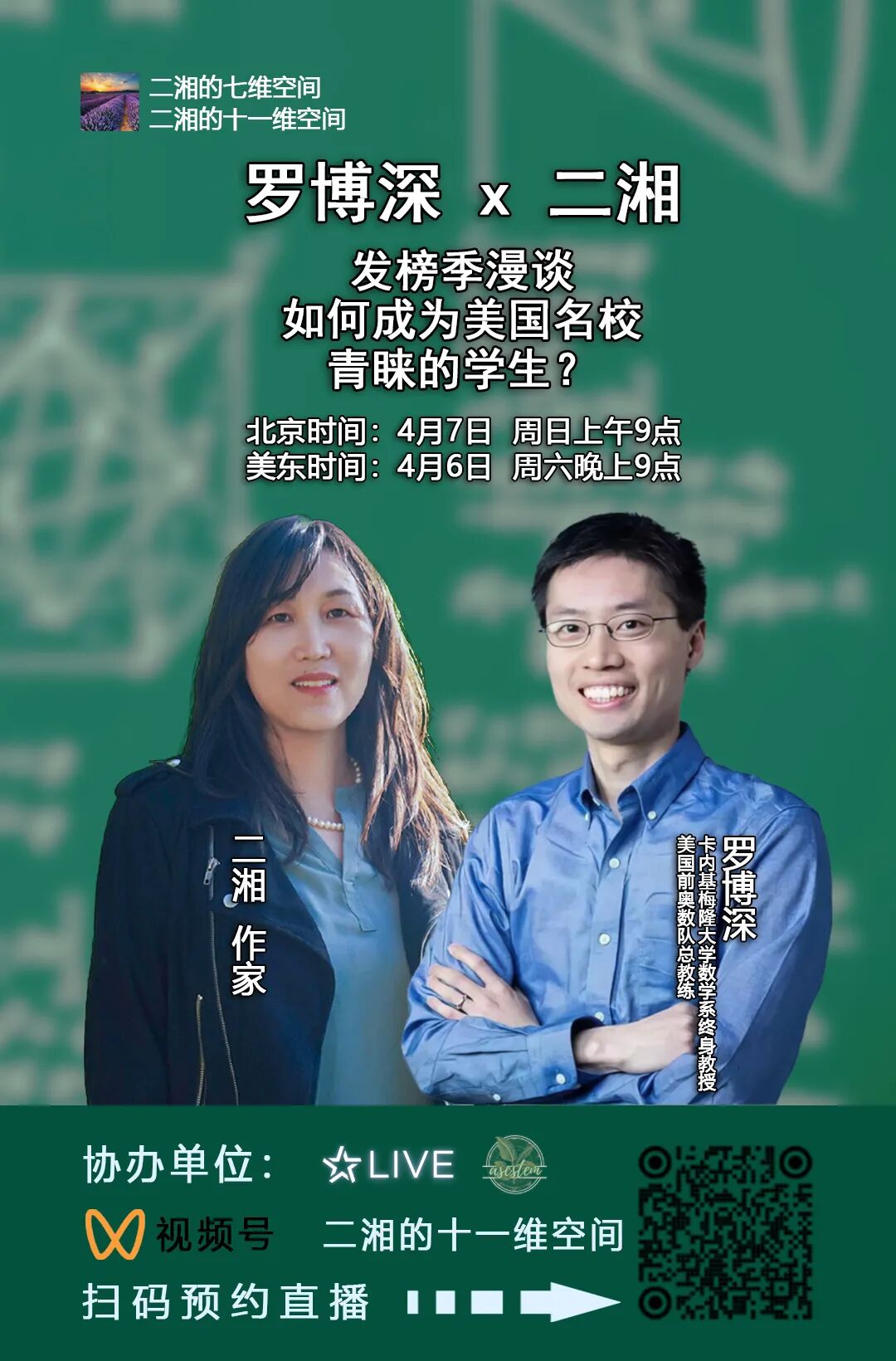 周日上午美国前奥数国家队总教练罗博深和二湘有一个直播,讲讲大学申请和孩子教育,欢迎收看。