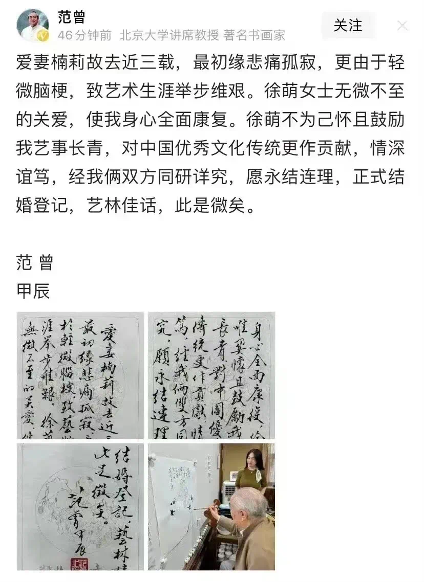 4月10日,86岁书画大师范曾在社交平台发文宣布再婚。