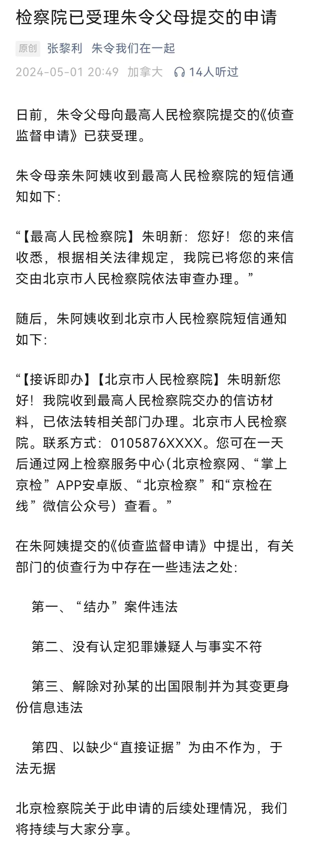 今天在公号“朱令我们在一起”看到一个振奋人心的消息,朱令父母向最高人民检察院提交的《侦查监督申请》已获受理。