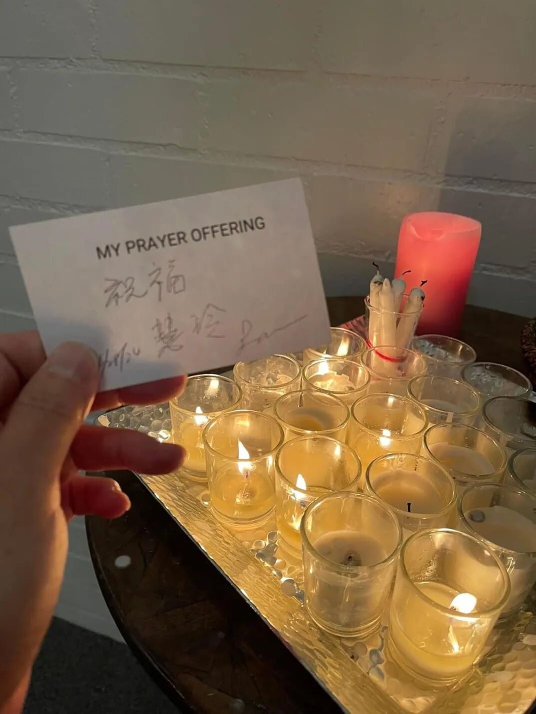 教会主日崇拜,教会的牧师,牧师娘,以及弟兄姐妹们都会为我祷告。我们也在教会的祝愿卡上写下朋友的名字,为他们点上蜡烛,将卡片放在十字架上献上我们的祝福。