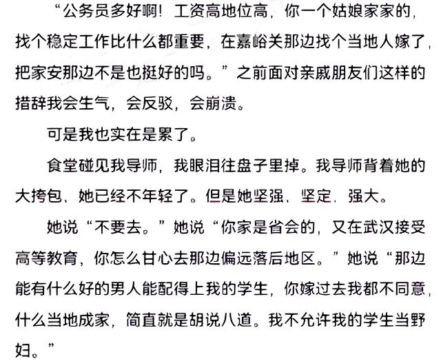 大家批评得已经火够大了,所以我不再凑这个热闹。作为一个经历了坎坷人生的六零后老阿姨,冷静客观地说,我倒是挺理解这孩子的。学校刚毕业,来到一个完全陌生的地方,一切都跟想象的不一样,于是失望到绝望,说出了一些真实的想法和感受,虽然语言有些刻薄,但也就是一个初出茅庐、稚气未干、娇生惯养、心气儿高傲的小女生记录的她刚入职几个月的心路历程,说白了就是她的心情和不成熟的感悟而已,观点偏激夸张。她是真敢写!我们不应该以自己在社会几十年的阅历看待一个年轻人的真实心态,而是应该体谅她的 “出格”。想想当年,许多人都有过对某种工作某个地方深恶痛绝的体验吧。