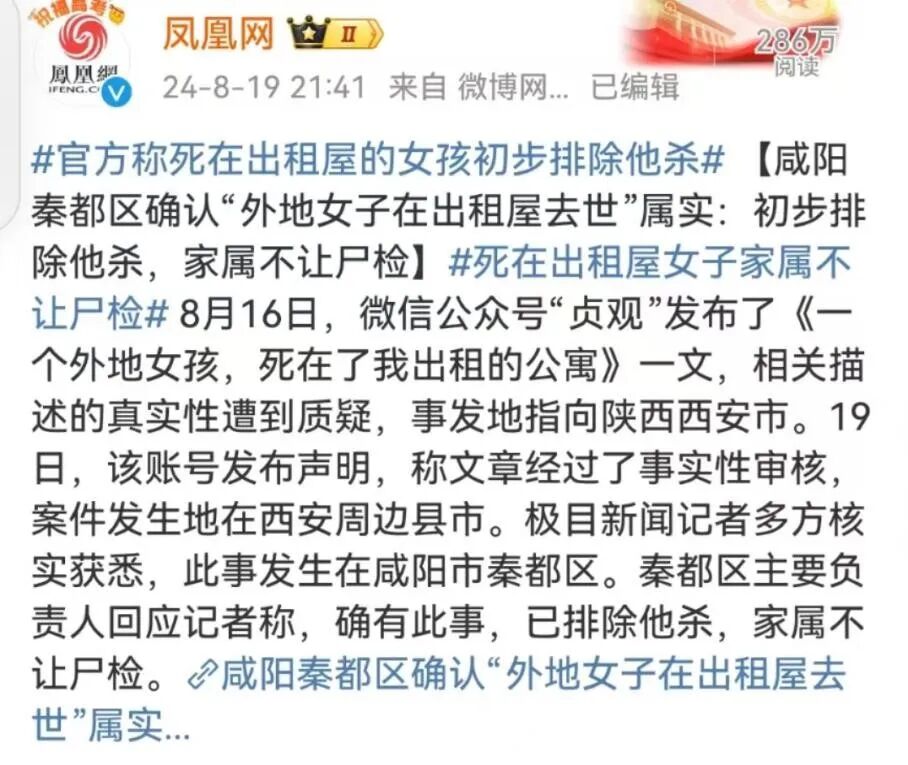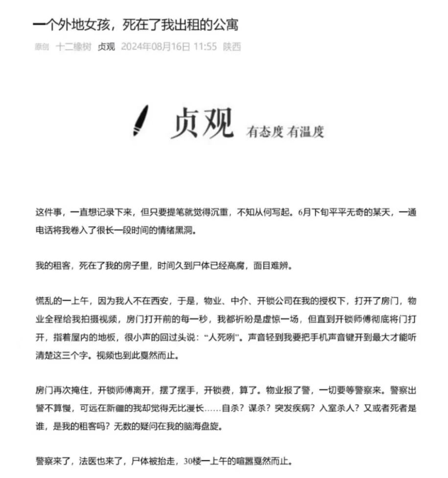 上周末,看到这篇《一个外地女孩,死在了我出租的公寓》,是网友发的PDF版,我只扫了一眼标题,以为是《故事会》里的故事,根本没点开。