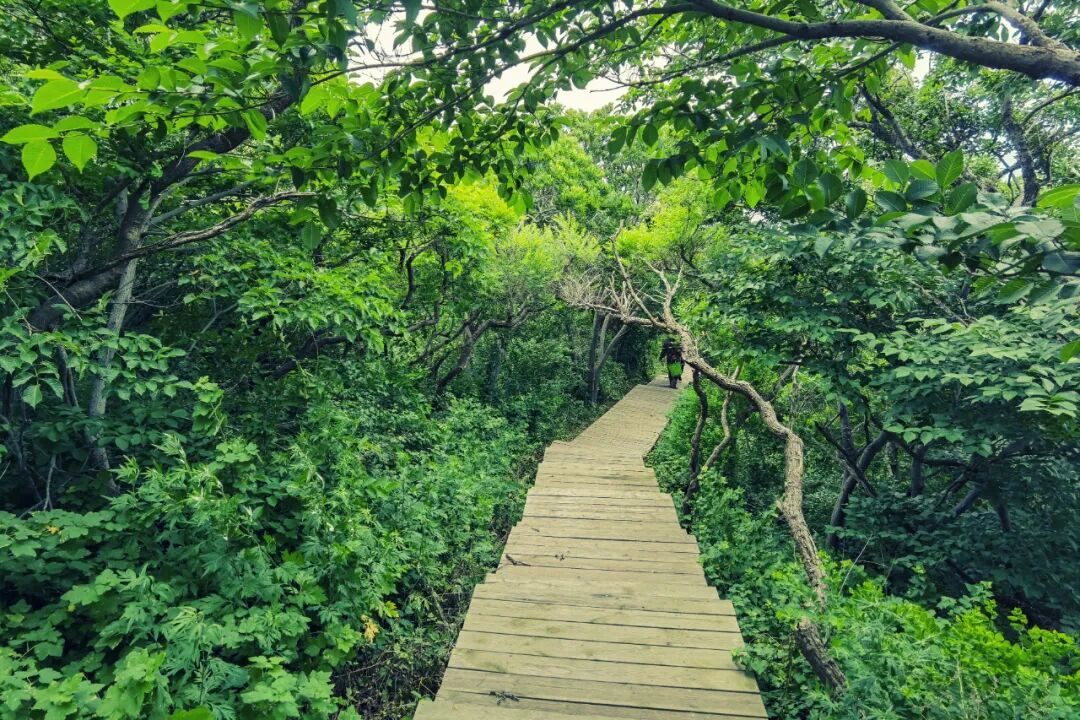 沿着曲折的栈道一路前行,途中阅蛇无数,慢慢发现恐惧和审美一样,也会疲劳。脚步开始变得轻松,眼睛也不再紧盯着路边、树上是否有蛇出没,拍的照片和视频也逐渐恢复正常水准。岛上手机信号还是来自陆地,时有时无,这倒是好事,不会因为突然进来的电话影响拍摄。到了山脊,海面吹来的雾气如倒悬的瀑布般自下倾泻而上,海风猎猎,树叶在风中飒飒。这一刻的蛇岛,迎风一侧云雾飘渺,背风一侧清爽澄澈,半是仙境半是人间,传说中的海外仙山大约如此吧。
