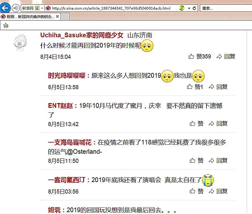 14天前,也就是8月4日的16点,新浪网发布《刚刚,新冠肺炎确诊病例全球感染人数突破两亿》。一条“什么时候才能再回到2019年的时候呢”的新闻评论,引起了网友们广泛的共鸣。