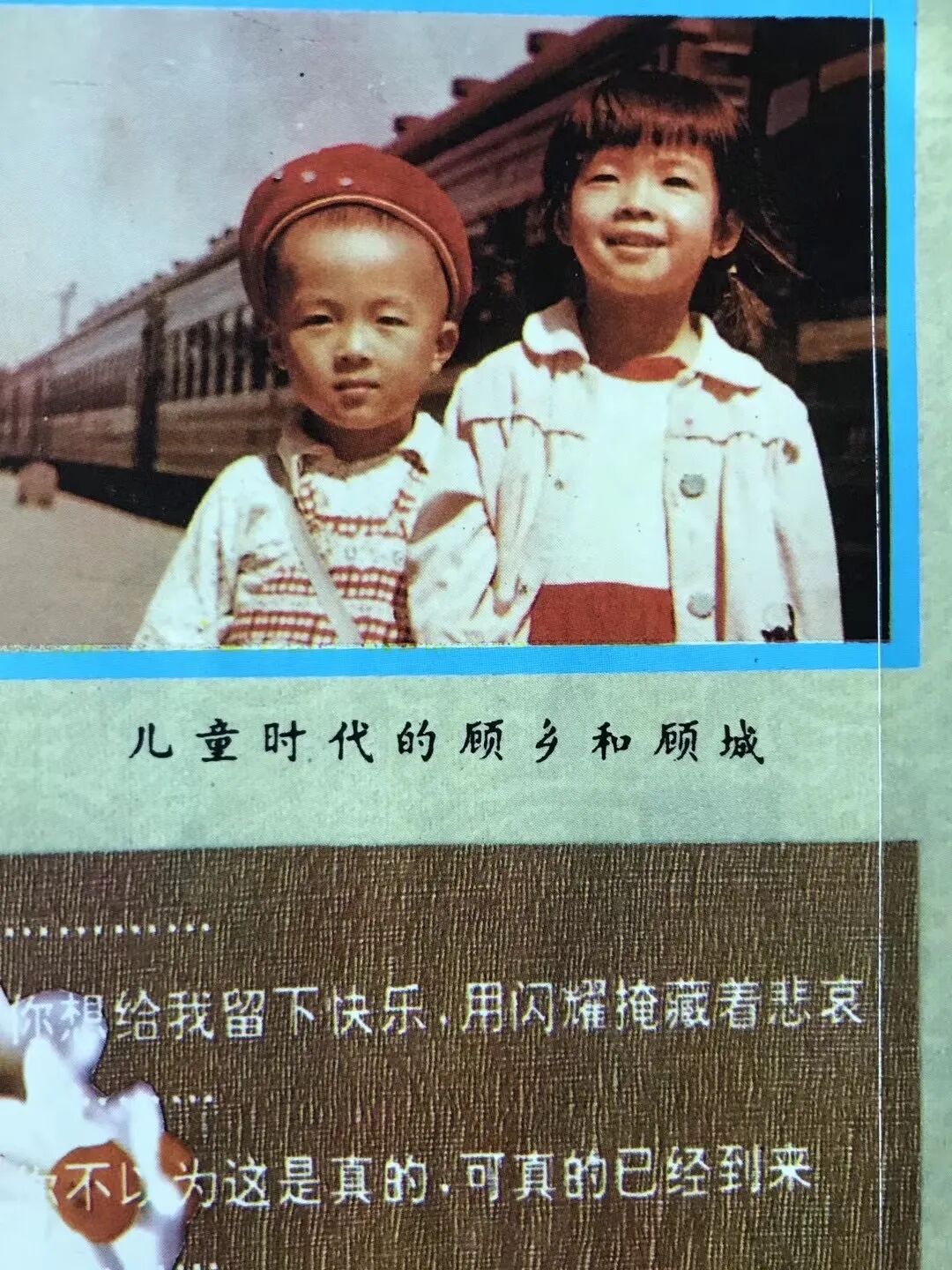 在顾乡《我面对的顾城最后十四天》这本书的封底勒口上,有一张顾乡顾城姐弟俩小时候的合影,这张照片被放大了摆在书柜上,照片里姐弟俩的身后是一列绿皮火车,我就问顾工先生这是在哪里拍的。顾工就解释,是一个星期天,听说天津有什么吃的,特地坐车去,结果没买上,照片是在火车站拍的,用的是八一电影制片厂的电影胶片的片头,所以是彩色的。我心想,部队文艺工作者的家庭生活条件真是优越啊,怪不得顾城老是长不大,总是那么“任性”。