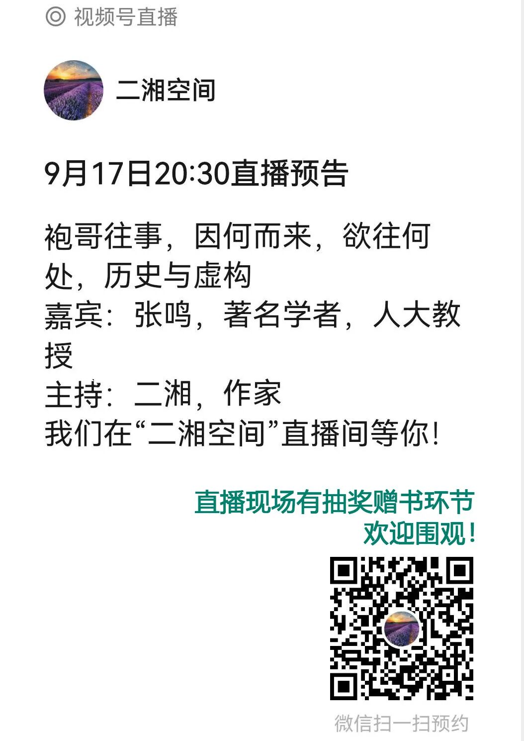 编者按:今晚8点30分,著名学者张鸣教授将在视频号“二湘空间”做一场直播活动,欢迎围观,长按下图二维码预约直播。