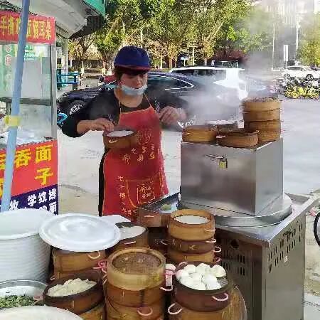 大年初四。一大早出门买饺子皮,就在小区东门入口,看见有一个摊子已经摆摊,卖蒸饺、小笼包和煮粉。