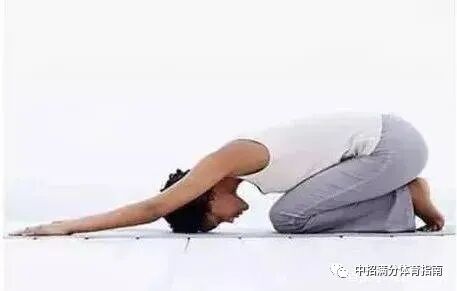 动作方法:在垫上跪立,脚尖向后。双手扶在背上部,上体后仰,背部肌肉收缩送髋。呼气,加大动作幅度,逐渐把双手滑向脚跟。动作幅度尽量大。拉伸25秒,做3~5组。