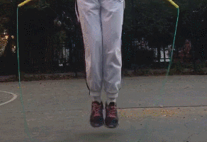 脚尖和前脚掌起跳落地,起跳高度不能太高,以刚能过绳子最好,落地时膝盖微屈做缓冲。