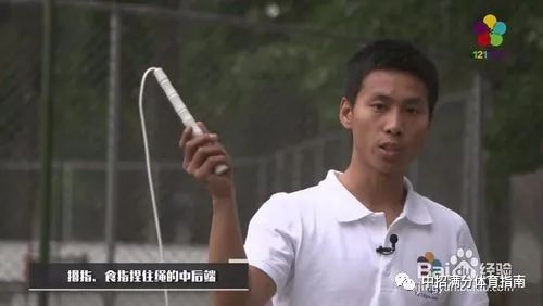 握在绳柄中后端。手心尽量向下或者相对、手心朝下更能发力。